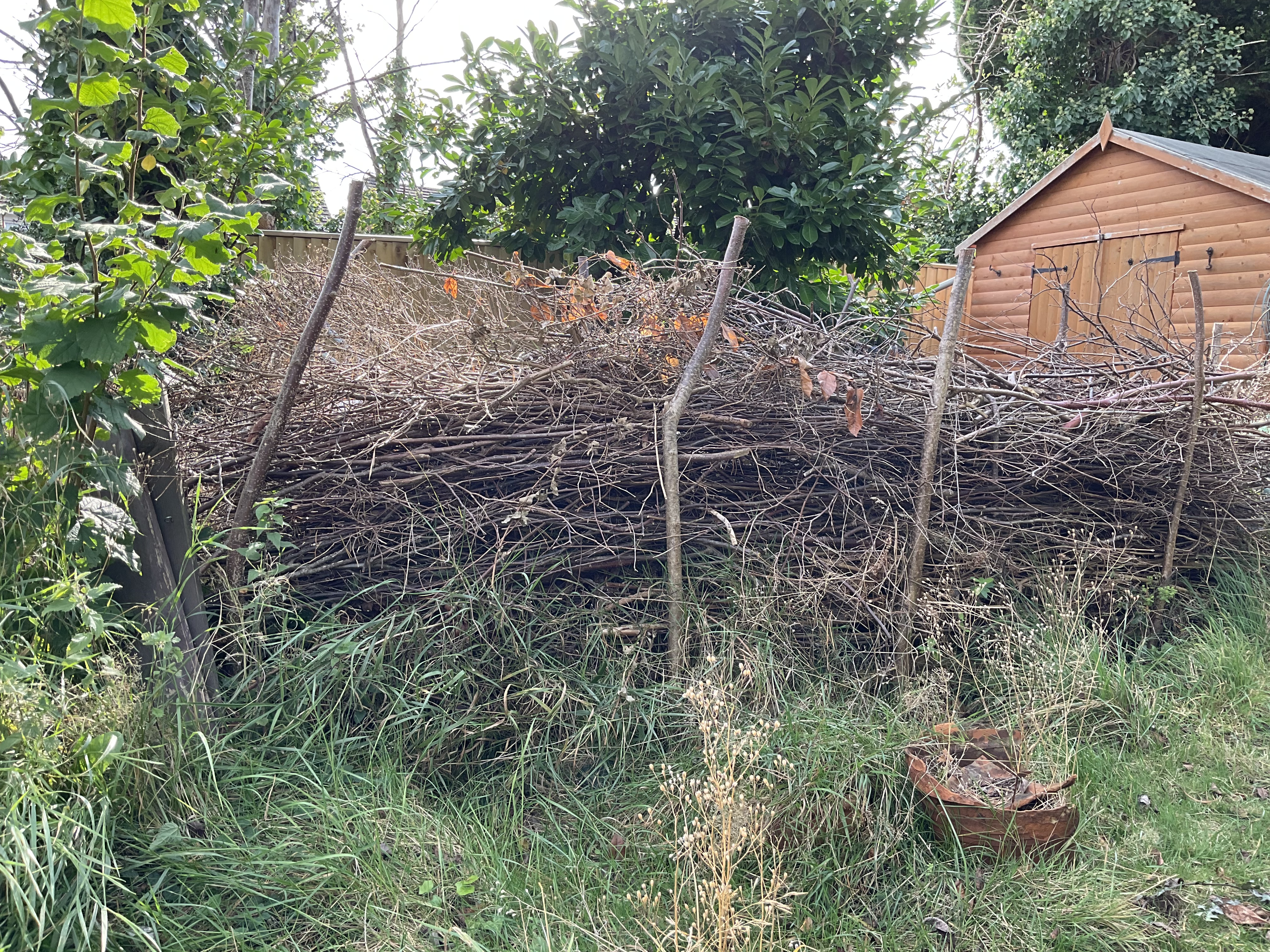 It’s in the same context a bug hotels and log piles. A dead hedge is just that, a hedge like structure created from dead woody plant material from the garden. I call them prunings but really it can be any length of wood, branches from trees and shrubs created when you cut back a shrub or reshape a tree. The prunings are piled up between two lines of parallel posts to create a structure that insects and spiders can live in and hopefully other creatures like hedgehogs can use it for shelter and little corridors to travel along.